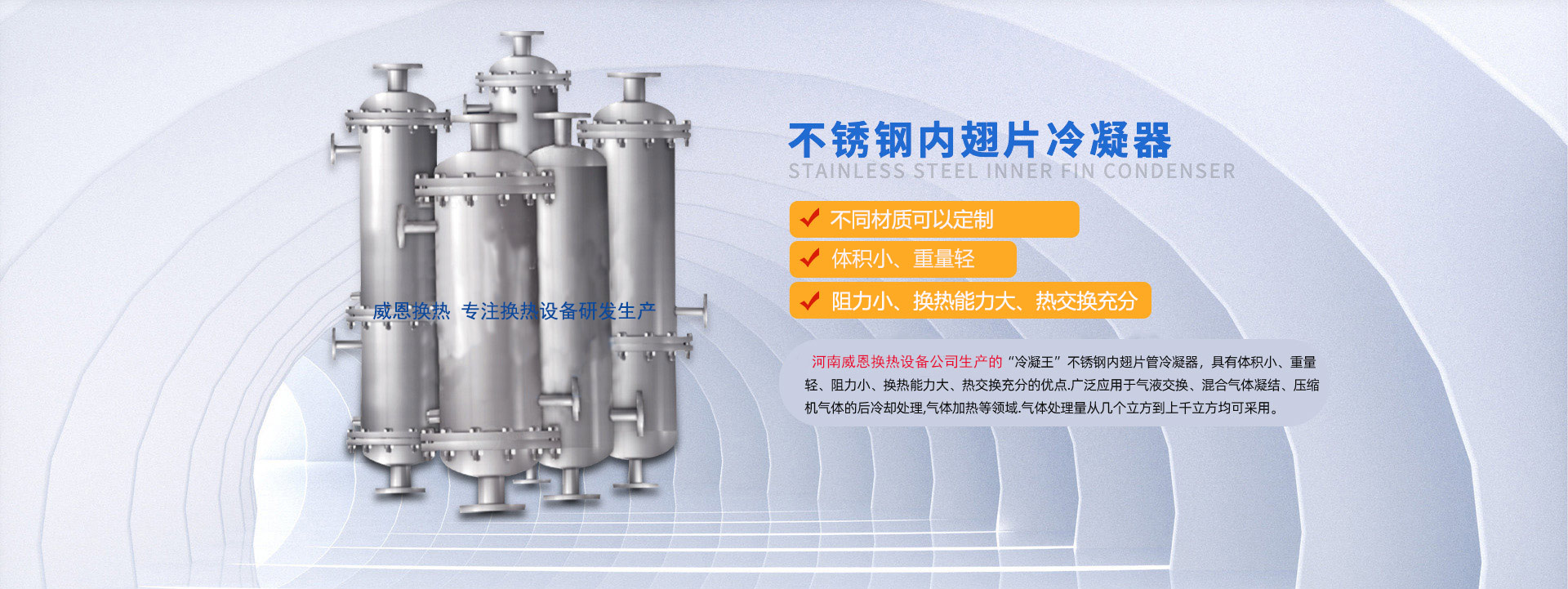 河南威恩換熱設備有限公司是一家專業生產制造螺旋板式換熱器、列管式換熱器、節(jié)能換熱設備的廠家,集科研、設計、生產、銷售、工程安裝、調試為一體的技術型企業。公司成立以來一直致力于節(jié)能環(huán)保換熱設備的研發(fā)生產,主要產品包括螺旋板換熱器、列管式換熱器、內翅片冷凝器以及鋼制儲罐、反應釜等的研發(fā)設計與銷售。公司研發(fā)生產的螺旋板式換熱器,傳熱效率高、可靠性高、阻力小、不易堵塞、可有效回收低品位熱能,已經廣泛應用到化學、石油、溶劑、醫藥、食品、輕工、紡織、冶金、軋鋼、焦化等行業,取得了良好的效果,得到顧客的廣泛認可和一致好評。針對制藥行業,本公司生產的新型不銹鋼內翅片換熱... 【了解更多】